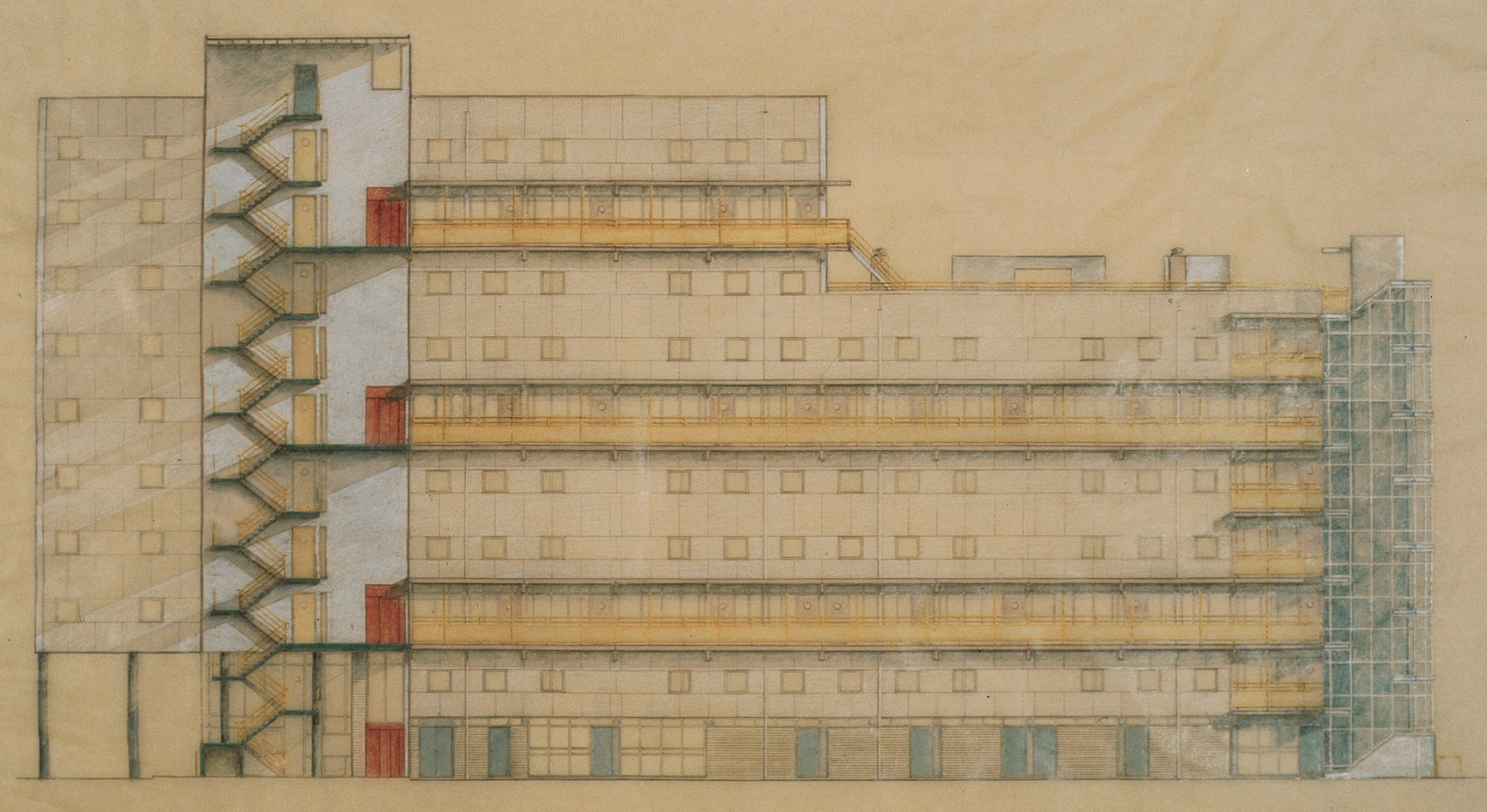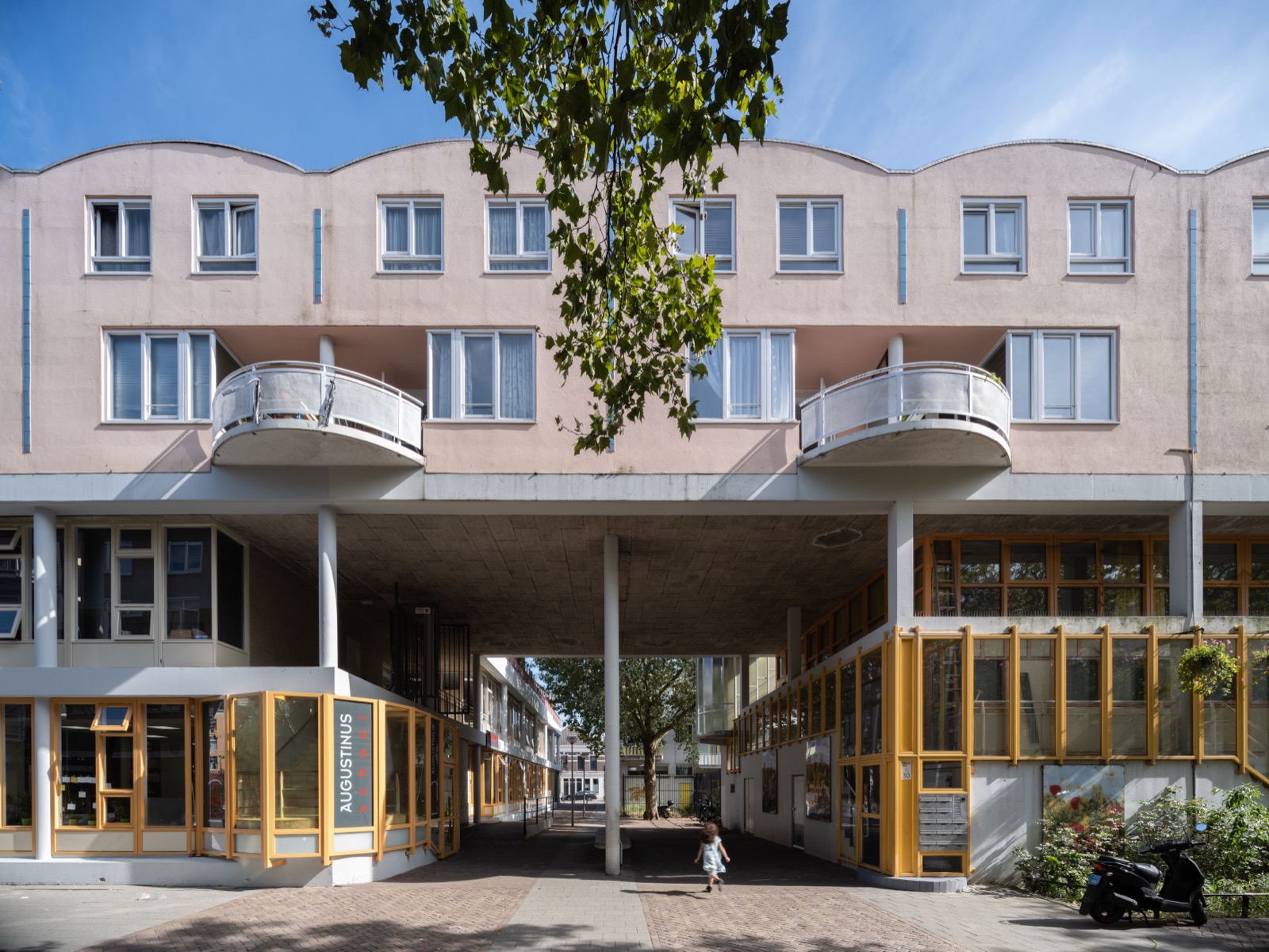 De school heeft zoveel mogelijk glas in de gevel. De gymnastiekschool heeft een gevel van glazen bouwstenen, zodat er overdag daglicht binnenkomt en ’s avonds licht schijnt in de straat. De maisonnettes zijn bereikbaar vanaf een woondek aan de achterzijde. De woningen hebben een halfronde bekroning, een variant op de toen populaire mansardekap; beide bedoeld als originele verwijzing naar de typische Rotterdamse straatwanden met schuine kappen.