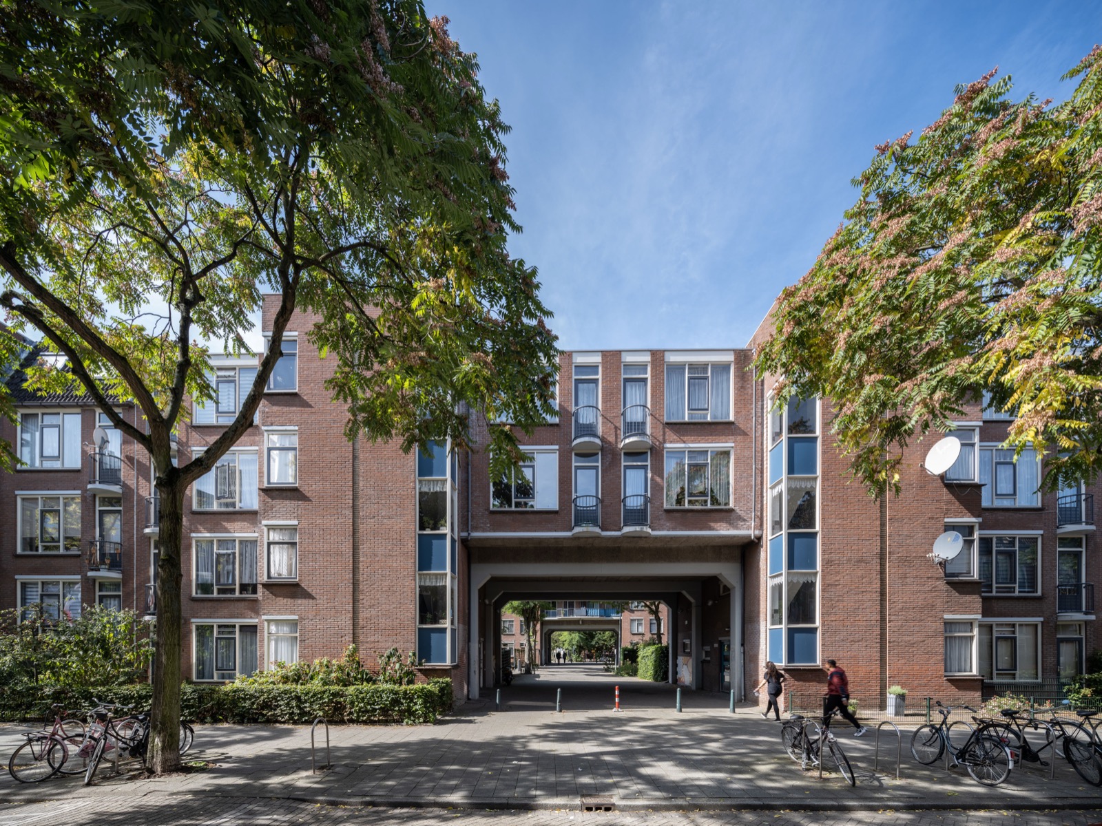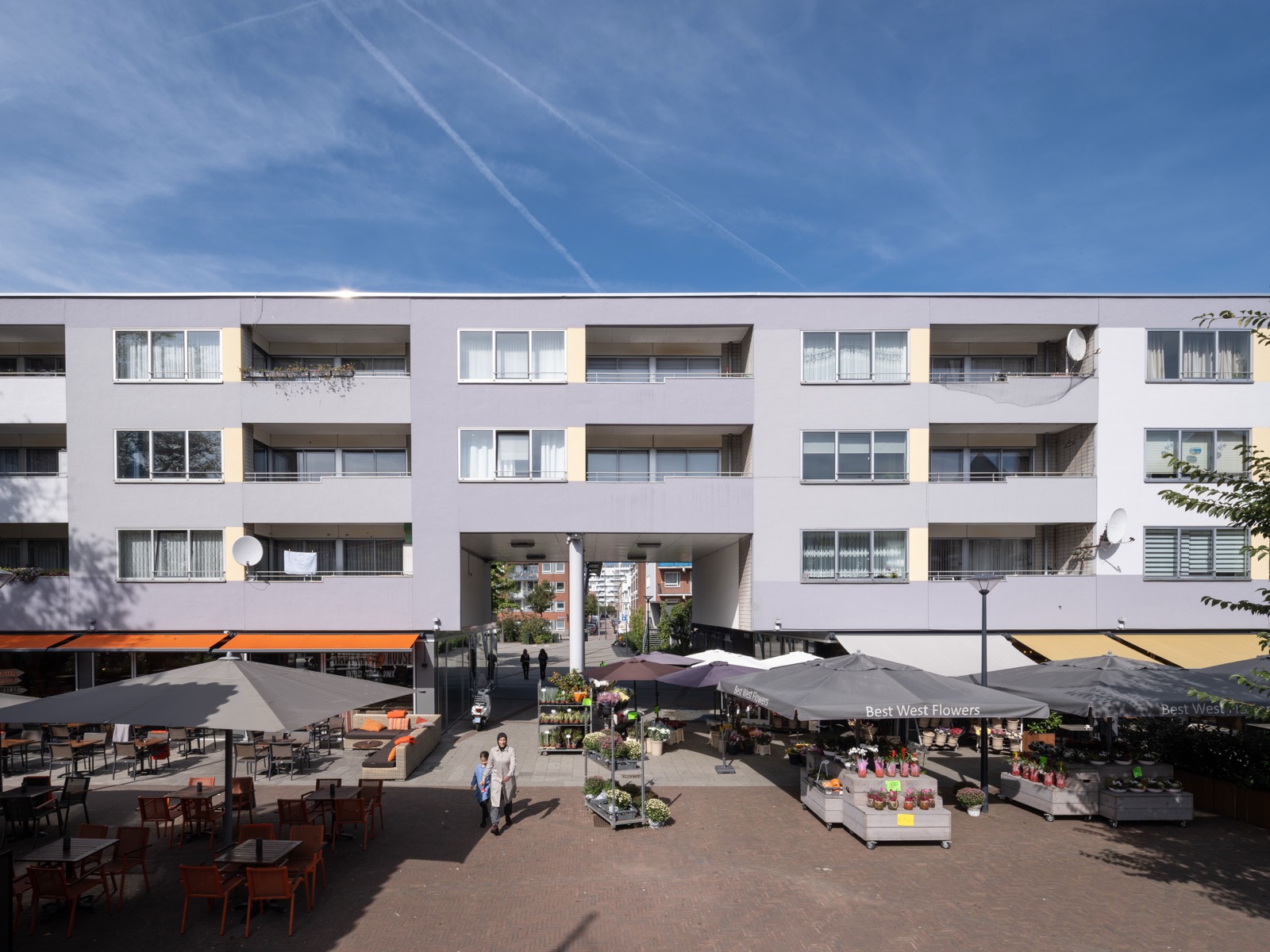 De bijzondere functies liggen op de begane grond en hebben een neutraal rasterwerk van glas en beplating als gevel. De woningen erboven hebben grotendeels bakstenen gevels. Het zijn maisonnettes die aan een binnenstraat liggen. De ruimtes op de begane grond krijgen licht door stroken glazen bouwstenen. De hoge en lage delen zijn van elkaar gescheiden door markante halfronde gesloten trappenhuizen die al kort na de bouw weer werden opgemaakt. Aan de noordkant van de Kogelvangerstraat is nog een oorspronkelijke variant hiervan te zien.
