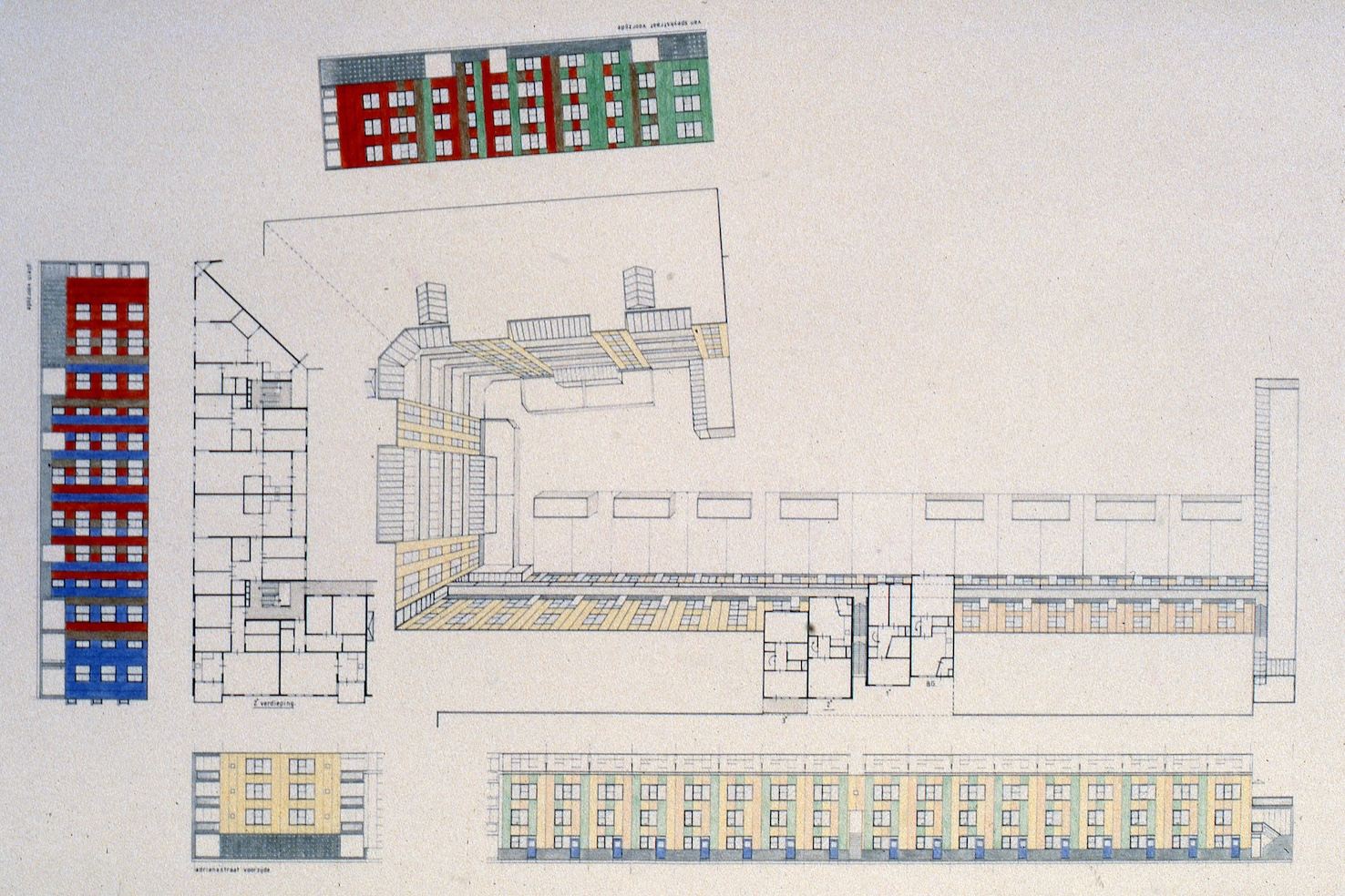 De vernieuwing van de Adrianastraat en Van Speykstraat bestaat uit in totaal vijf invullingen in de straatwanden. In dit project werden studies naar de opbouw van stedelijke bouwblokken en naar de architecten van het Nieuwe Bouwen verwerkt. Met name het vraagstuk van de individuele woning in een stedelijk bouwblok werd hier heel specifiek uitgewerkt. Door het abstracte patroon van de kunststof gevelplaten was de individuele woning niet herkenbaar. De in een grafisch patroon aangebrachte kleuren – wit, grijs, geel, roze, rood, blauw en bruin – waren zeer karakteristiek voor het project